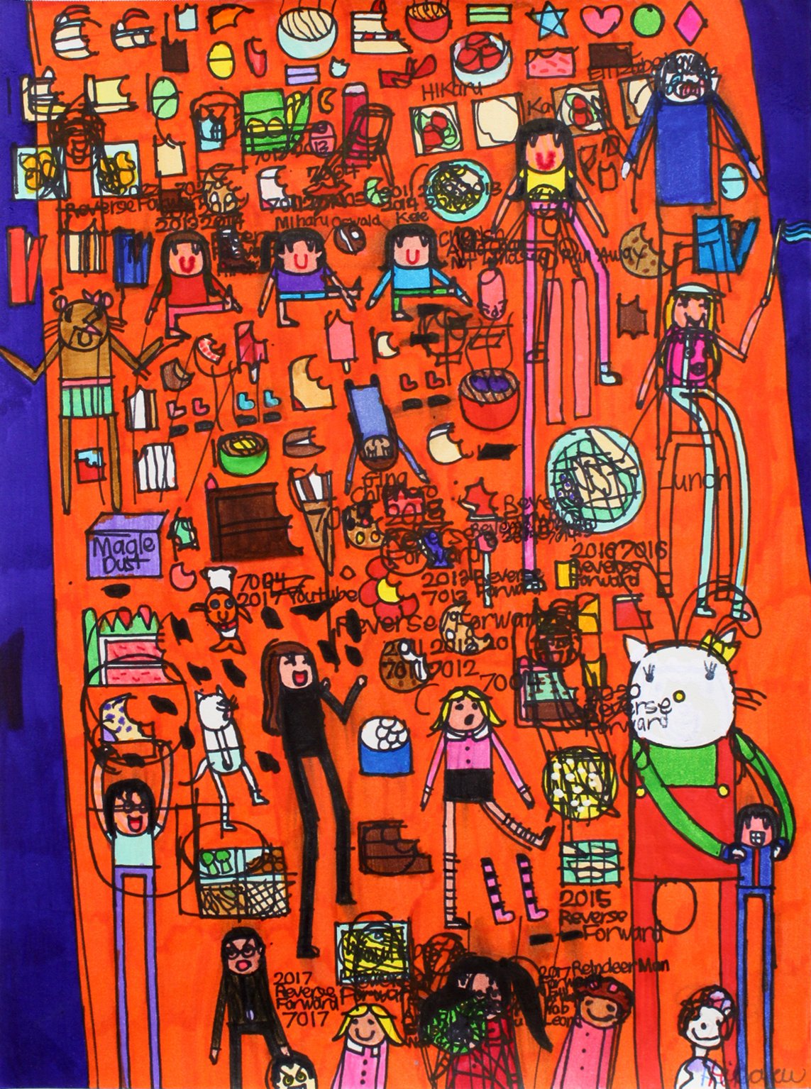 “It’s all about Hikaru Fong’s Born Again Future. About living and living long life. I make art about drawing. Drawing mermaids, octopus, sea turtle, fish, puffer fish, and oceans. About Next Time and Reverse and Move Forward. About the Future Later Will Happen Again. It’s not a fake, it’s going to happen. It’s Living Long Life Born Again and that’s real. It’s not a fake, not just a drawing. I am going to be born again in the future later. Long long time -- after I move into group home. I wish I could deal with noise everywhere and move forward. I wish I could use the uphill ladder and go up to heaven upstairs in the cloud when I am old, old, old. I’m not old, I am young and healthy but it will happen in the future and it is real.”