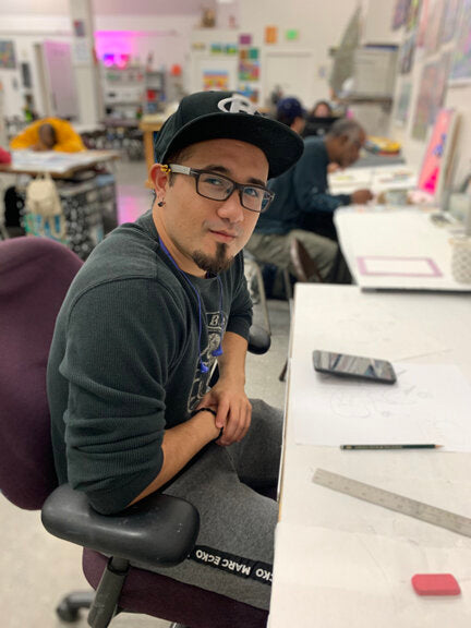 Christopher Romero has been working at the ECF Art Centers’ Downtown LA studio since 2012. Romero’s work is largely influenced by his fascination with and immersion in the spheres of contemporary popular culture fandom. His body of work is rife with the subtexts and symbols of the new and popular - specifically film, music, fashion and social media. By culling inspiration and content from these various mediums, Romero’s work functions as a modality wherein he can insert his own voice into the ever changing current of contemporary culture. As such, his work reveals a desire to invert outsider positionalities, a way to re-imagine a world large enough to include infinite points of view. Outside of the studio, he is an avid film-goer and health and fitness enthusiast. He loves shopping, discovering new music, and making new friends.