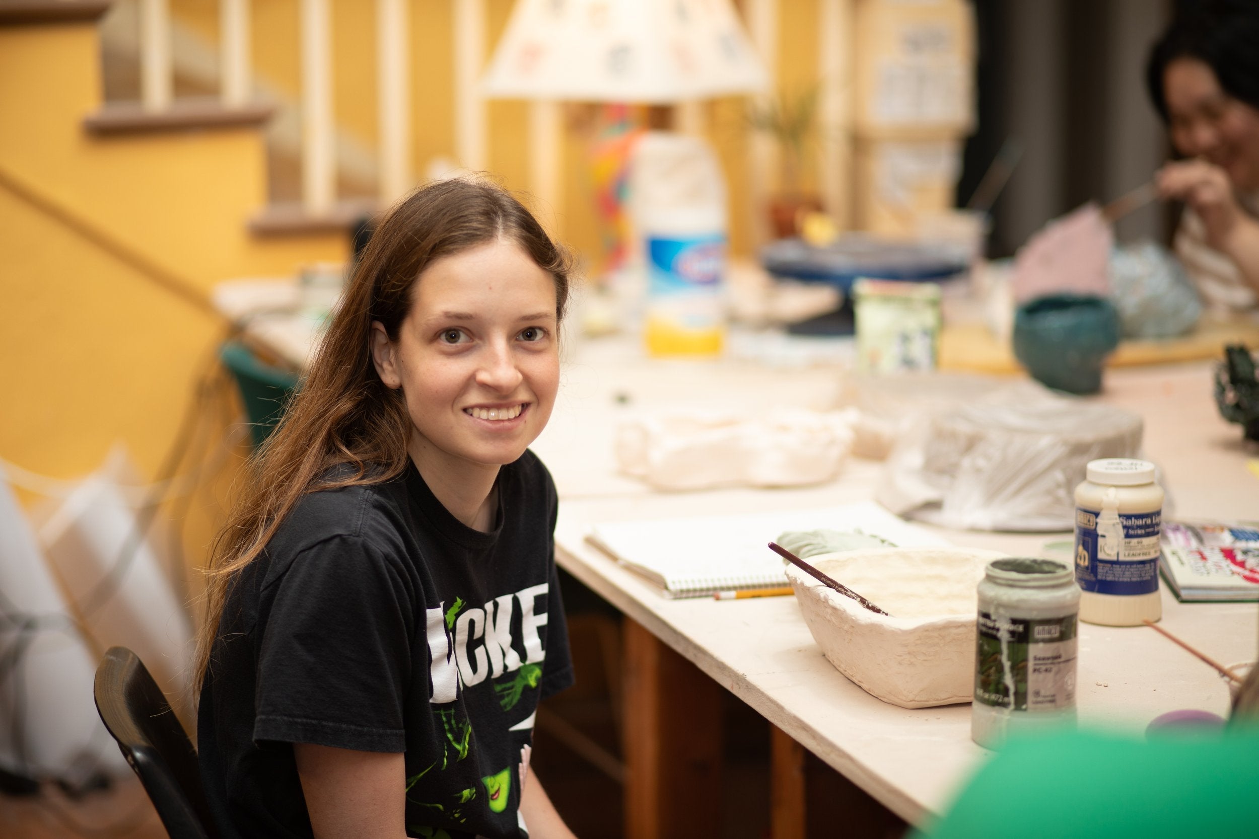 Hi, I’m Jillian! I started going to the ECF Art Studio in August 2023. I like to use acrylic paint, markers, colored pencils, and clay. My favorite way of working is by making hand-built ceramics. My work is about my love of theater and fruit, and I use a lot of repetitive elements. In addition to being a visual artist, I am also a performer; I am inspired by theaters because I have been in plays in the past. I work by using references of theaters I see online, but I am also inspired by art in museums. I am especially inspired by ceramic art. I like to use colors like green, purple, and yellow to make people feel relaxed and happy when they look at my work because that is how I feel when I am making it.