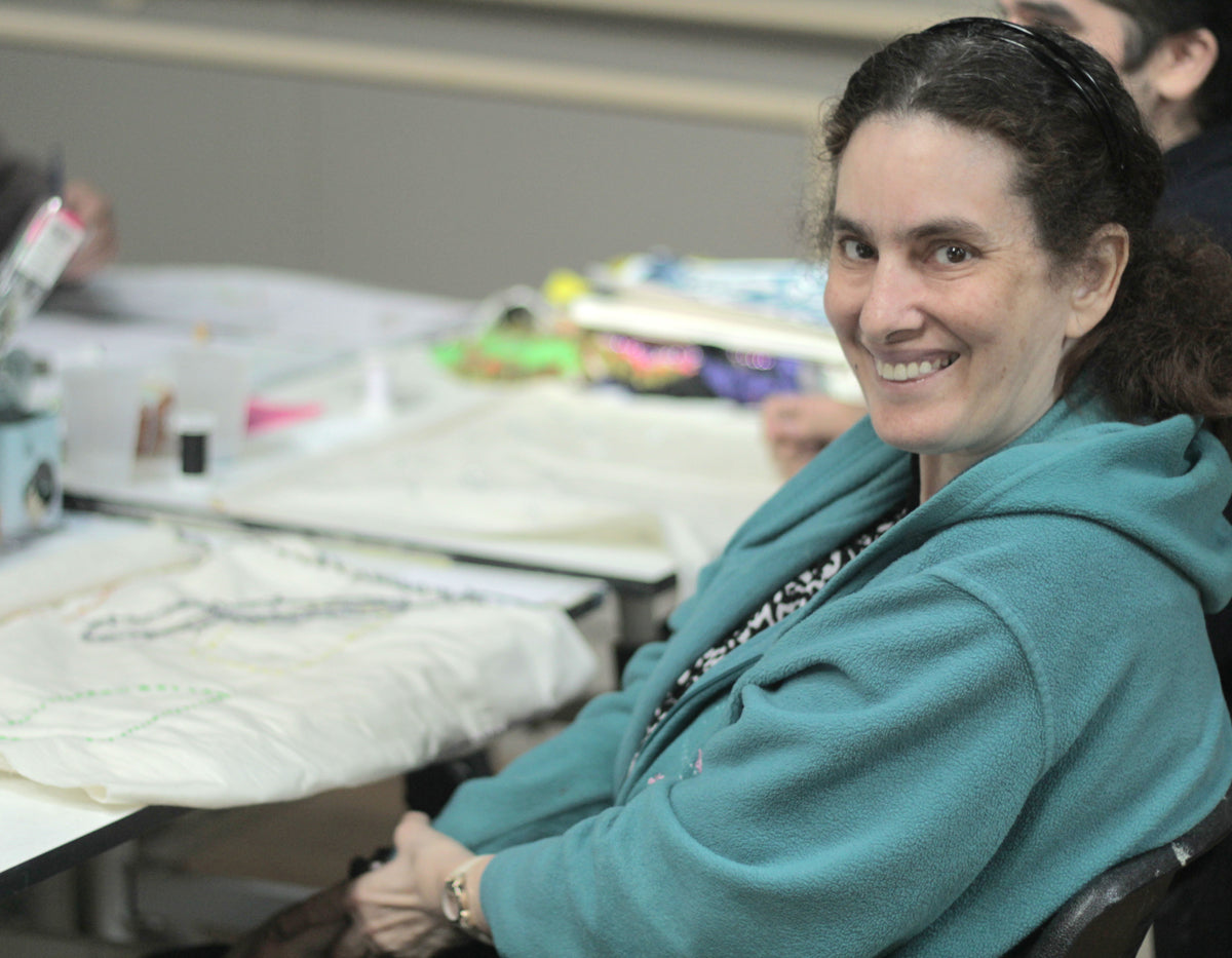 Maria Alvarado has worked out of ECF Art Centers' San Pedro studio since 2012. Maria came to the ECF Art Center after leaving a Work Program where she attended many years diligently working with her hands and enjoying what she did. At the ECF Art Centers Maria began to explore her creative freedom and using different mediums including ceramics, drawing and painting. Recently Maria discovered her passion for textile work and learned to sew from her Art Instructor Mia. Using a variety of fibers she creates functional and decorative pieces which are often mixed with beads, bold stitch lines and layers of fabric. Maria has even completed a piece for her sister Angie who also attends the ECF Art Center San Pedro. Maria has a playful personality and likes to make friends at the studio; she enjoys trips to local museums and galleries and attending Foodie Club in the studio.